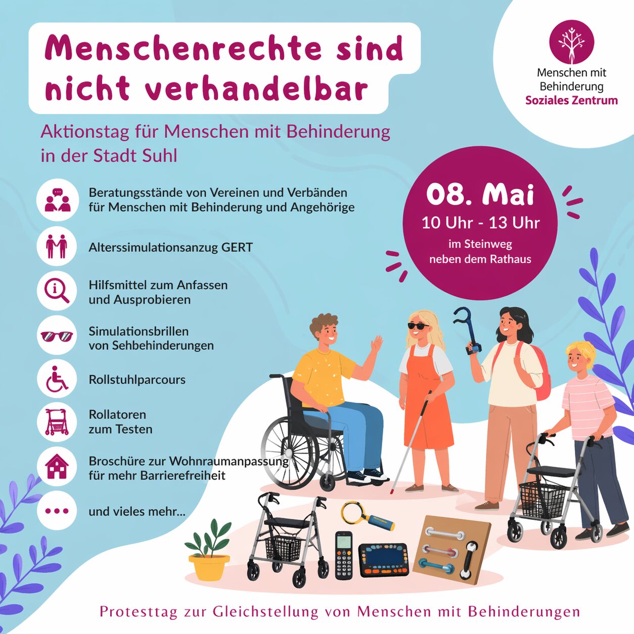 Anlässlich des bundesweiten Protesttages zur Gleichstellung von Menschen mit Behinderungen am 5. Mai lädt das Sozial- und Gleichstellungsbüro der Stadt Suhl gemeinsam mit dem Behindertenbeirat Suhl zu einer Aktionsmeile in die Suhler Innenstadt ein. Unter dem diesjährigen Motto „Menschenrechte sind nicht verhandelbar“ steht die Förderung von Inklusion und gesellschaftlicher Teilhabe im Mittelpunkt.
