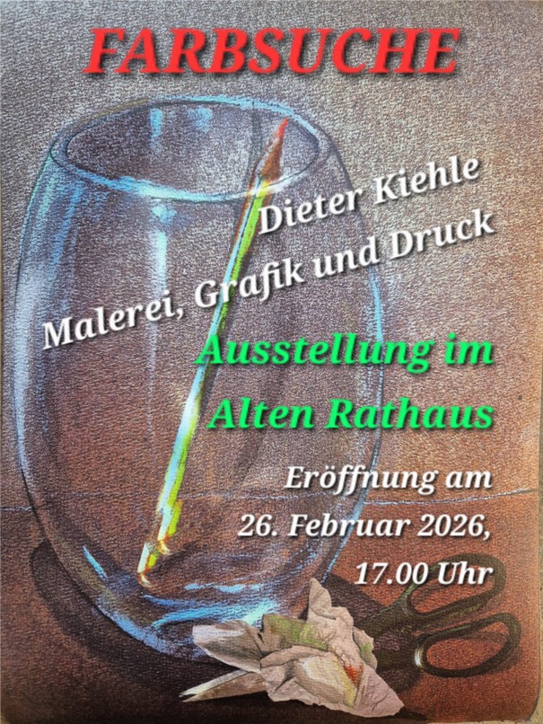 Ausstellung im Alten Rathaus Suhl ab 26.Februar 2026. Eröffnung am 26.02.2026 um 17.00 Uhr. Die Ausstellung „Farbsuche“ präsentiert Malerei, Grafik und experimentelle Fotografie mit Stillleben, Landschaften und Akten im Spannungsfeld von Farbe und grafischen Elementen. Interessierte sind herzlich eingeladen.