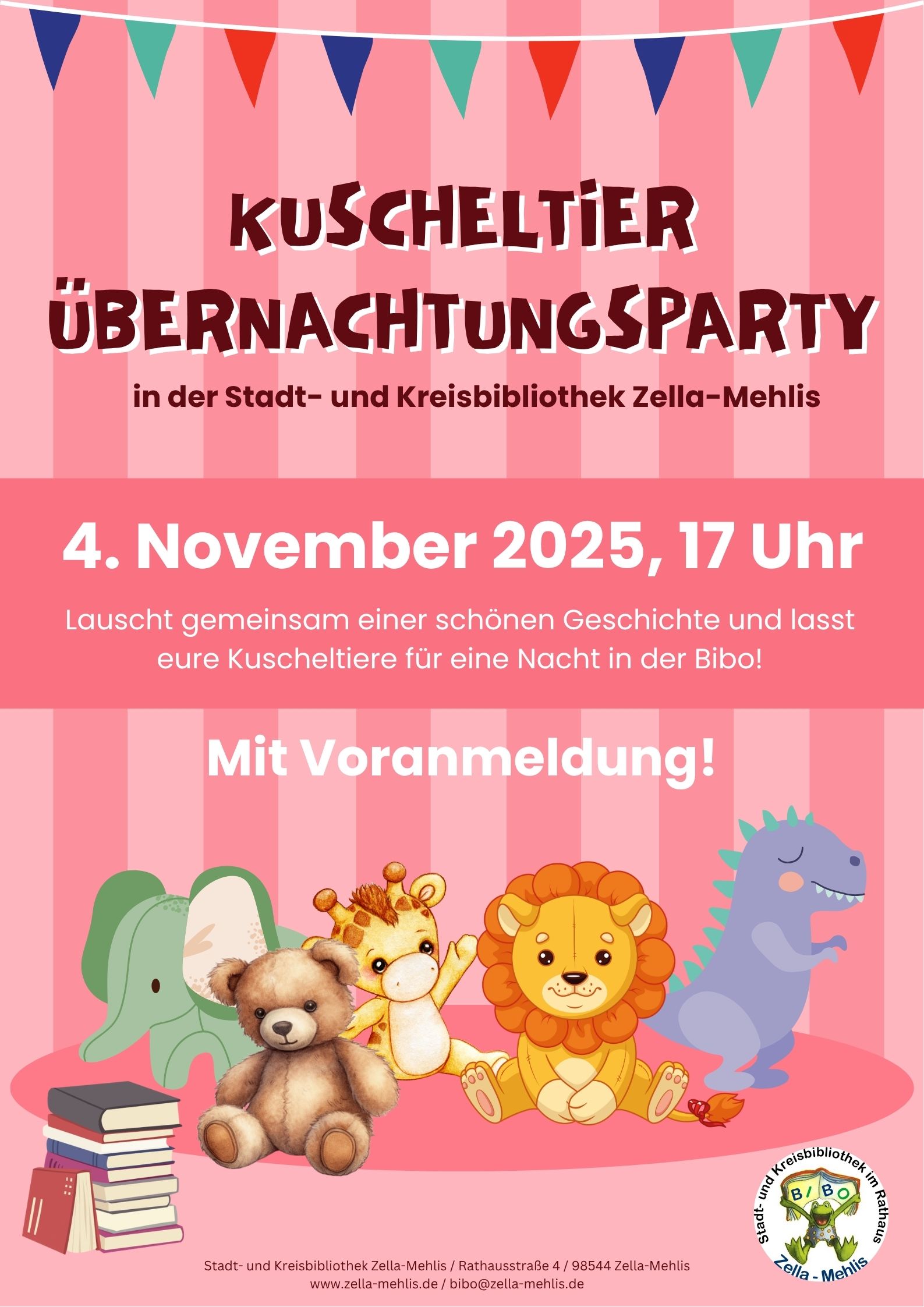 Bringt uns euer Kuscheltier am 04. November zu uns in die Bibliothek, erlebt gemeinsam um 17:00 Uhr eine spannende Vorlesestunde und verabschiedet euch dann von euren Lieblingen.