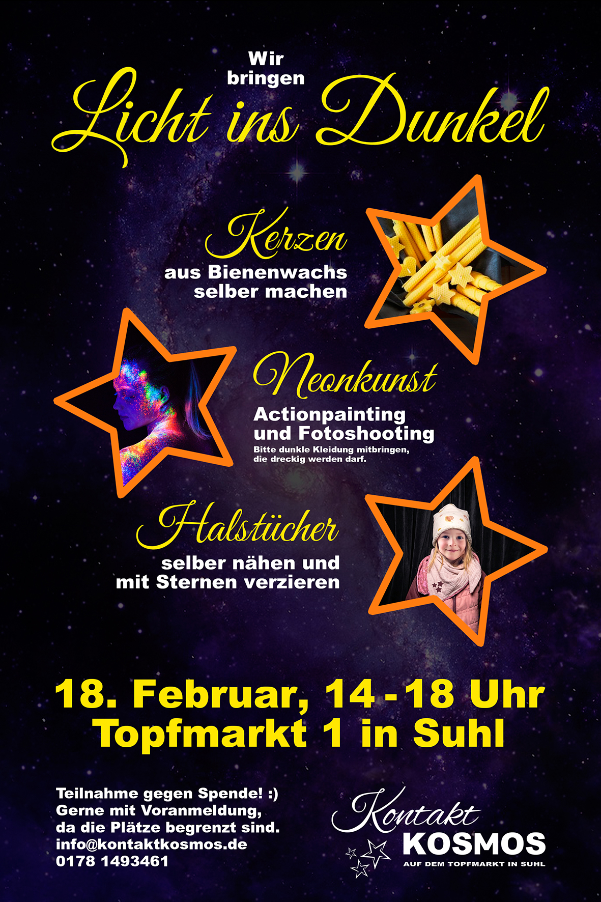 Der KontaktKosmos öffnet am 18. Februar von 14 bis 18 Uhr seine Türen und lädt euch herzlich ein! Kommt vorbei und bringt mit uns ein wenig Licht in die dunkle Jahreszeit!:)