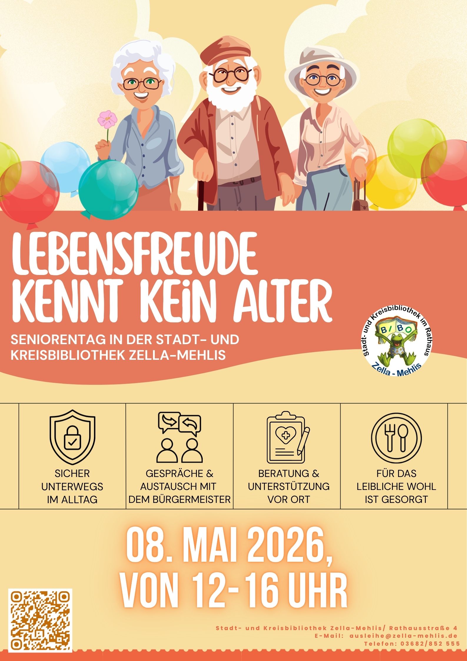 Gemeinsam mit zahlreichen Kooperationspartnern bieten wir im Mai einen Seniorentag unter dem Motto „Lebensfreude kennt kein Alter“ an. An einem Nachmittag erwarten Seniorinnen und Senioren vielfältige Informations- und Unterhaltungsangebote, sowohl in den Räumen der Stadt- und Kreisbibliothek als auch auf dem Rathausvorplatz.