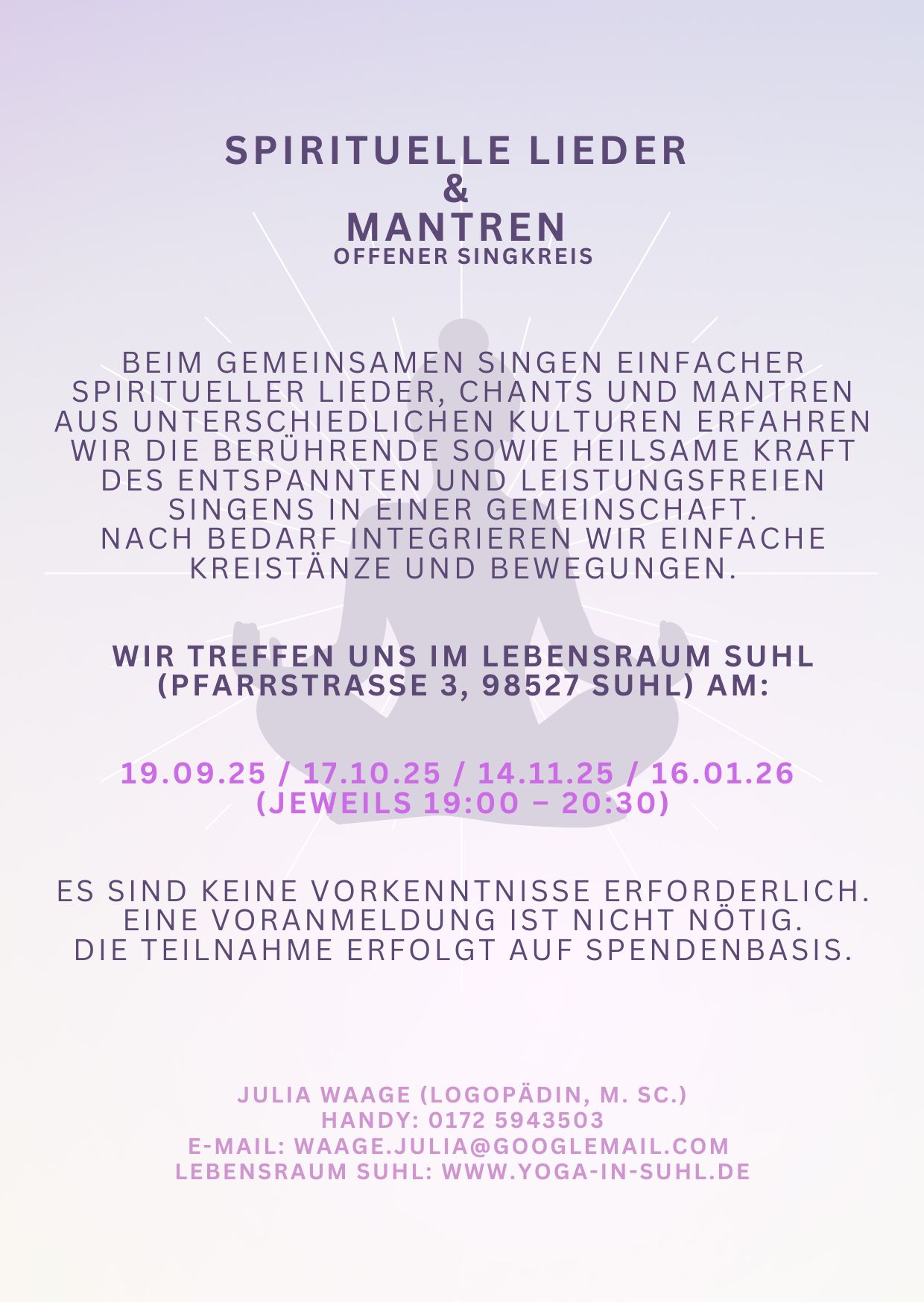 Beim gemeinsamen Singen einfacher spiritueller Lieder, Chants und Mantren aus unterschiedlichen Kulturen erfahren wir die berührende sowie heilsame Kraft des entspannten und leistungsfreien Singens in einer Gemeinschaft.