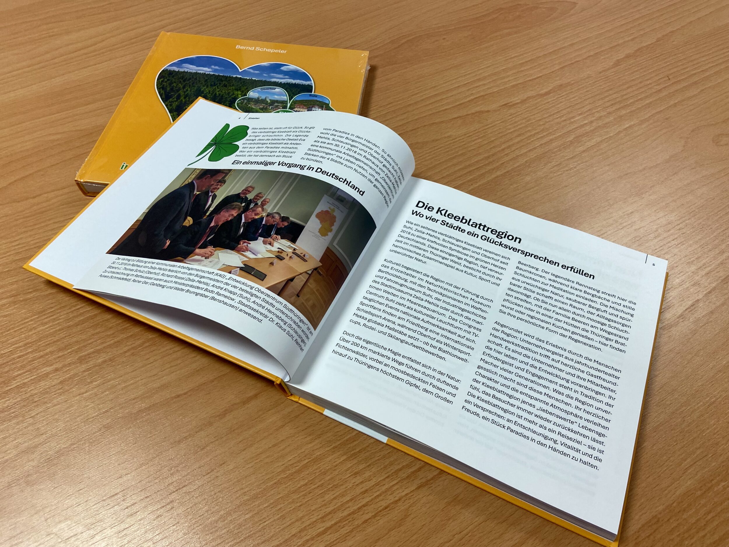 Das Buch stellt die Entwicklung der vier Städte Oberhof, Schleusingen, Suhl und Zella-Mehlis hin zu einer gemeinsam gedachten Region vor. Es beschreibt die seit 2018 vertiefte Zusammenarbeit der Kommunen, beleuchtet wirtschaftliche Stärken wie Präzisionstechnologie und Glasbehältertechnik und führt durch kulturelle und touristische Höhepunkte der Region – vom CCS Suhl über die Bertholdsburg bis zu Oberhofs Sportstätten. Zudem zeigt das Buch, wie Natur, Sporttradition und regionale Lebensqualität das Profil prägen und warum die zentrale Lage der Kleeblattregion ein entscheidender Standortvorteil ist. Das Buch ist in den Tourist-Informationen Schleusingen, Suhl und Zella-Mehlis sowie in regionalen Buchhandlungen aller vier Städte erhältlich.
