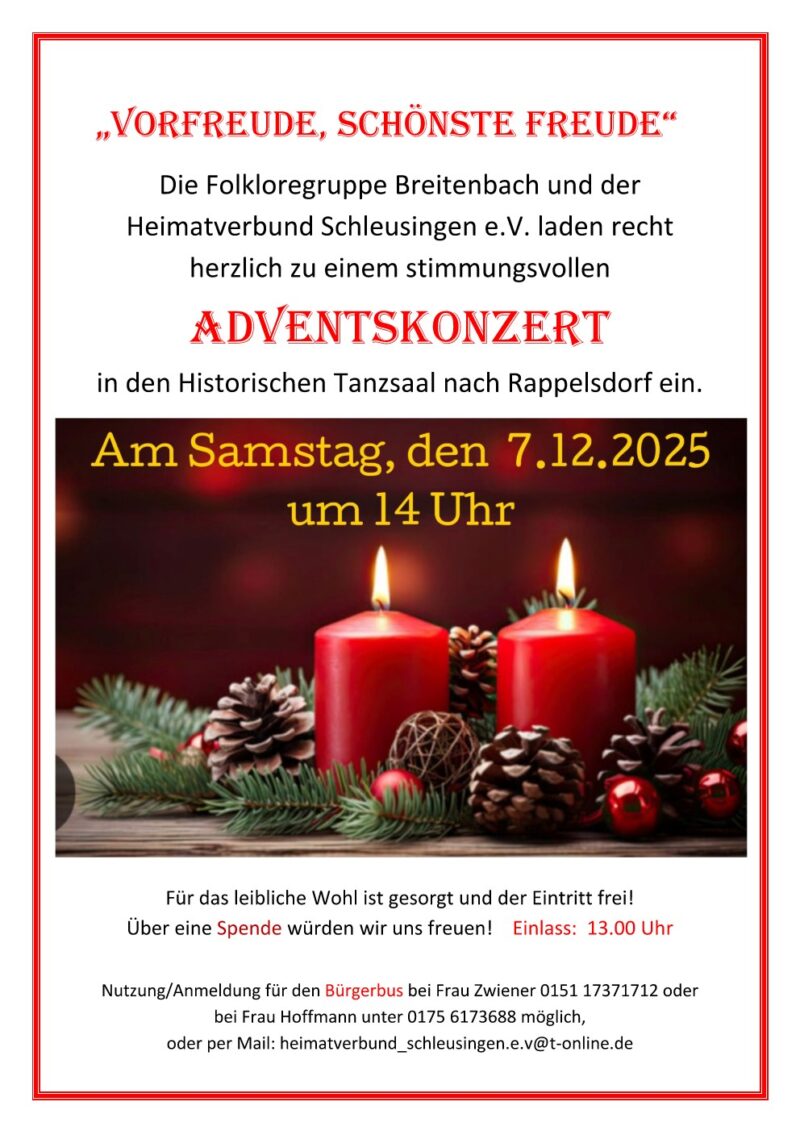 Musik im Advent – unter diesem Motto gestaltet der Mühlenchor Albrechts auch in diesem Jahr sein traditionelles Adventskonzert. Chormusik, kleine Mundartgeschichten und Instrumentalmusik erwarten die Besucher, die sich am 14.12., dem 3. Sonntag im Advent, diese kleine Auszeit gönnen möchten. Wir würden uns freuen, Sie im schönen Ambiente der beheizten Kirche St. Nicolai begrüßen zu…
