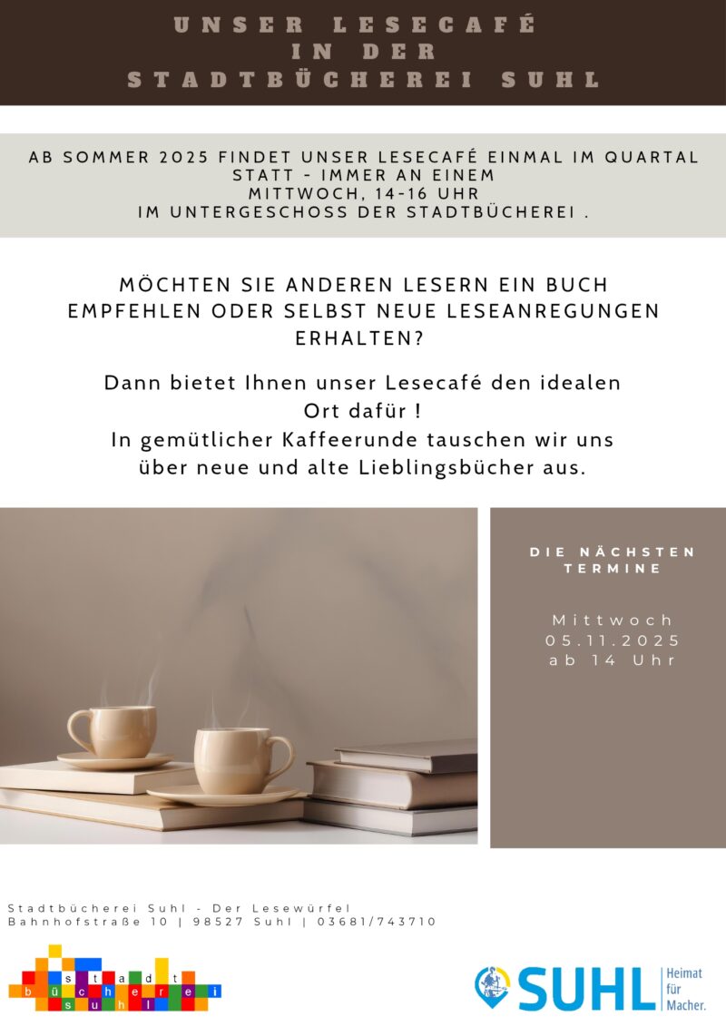 Möchten Sie anderen Lesern ein Buch empfehlen oder selbst neue Leseanregungen erhalten? Dann bietet Ihnen unser Lesecafé den idealen Ort dafür! In gemütlicher Kaffeerunde tauschen wir uns über neue und alte Lieblingsbücher aus.