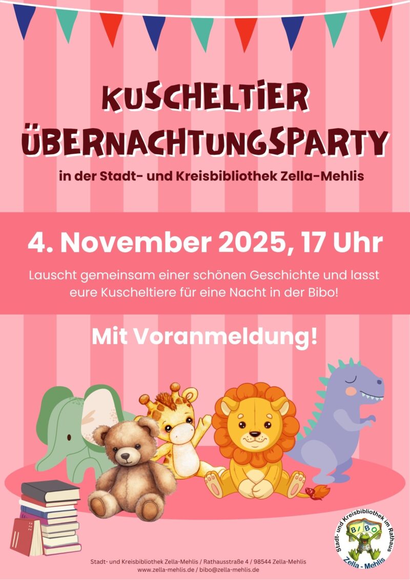 Kuscheltierübernachtungsparty in der Bibo Was passiert, wenn die Bibliothek geschlossen ist und es dunkel wird? Eure Kuscheltiere finden es für euch heraus! Bringt uns euer Kuscheltier am 04. November zu uns in die Bibliothek, erlebt gemeinsam um 17:00 Uhr eine spannende Vorlesestunde und verabschiedet euch dann von euren Lieblingen. Am 06. November dürft ihr sie…