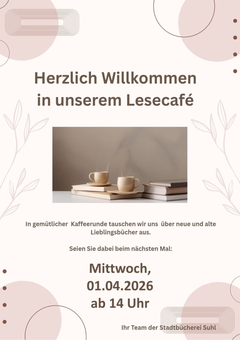 Am Mittwoch, den 1. April 2026, findet das nächste Lesecafé in der Stadtbücherei Suhl statt. Von 14:00 bis 16:00 Uhr können sich alle Interessierten in einer gemütlichen Kaffeerunde über alte und neue Lieblingsbücher austauschen. Ein idealer Ort, um anderen Lesern ein Buch zu empfehlen oder selbst neue Leseanregungen zu erhalten. Probieren Sie es aus.