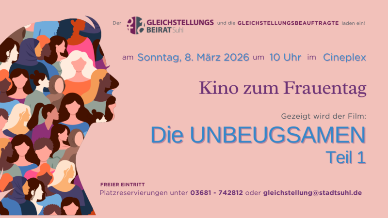 Der Gleichstellungsbeirat und die Gleichstellungsbeauftragte der Stadt Suhl laden herzlich zu einem besonderen Kinoerlebnis anlässlich des Internationalen Frauentags ein. Am Sonntag, den 8. März 2026, um 10:00 Uhr zeigt das Kino Cineplex Suhl den ersten Teil des preisgekrönten Dokumentarfilms „Die Unbeugsamen“. Nachdem der zweite Teil im vergangenen Jahr begeisterte Reaktionen hervorrief, kehrt nun der Auftakt…