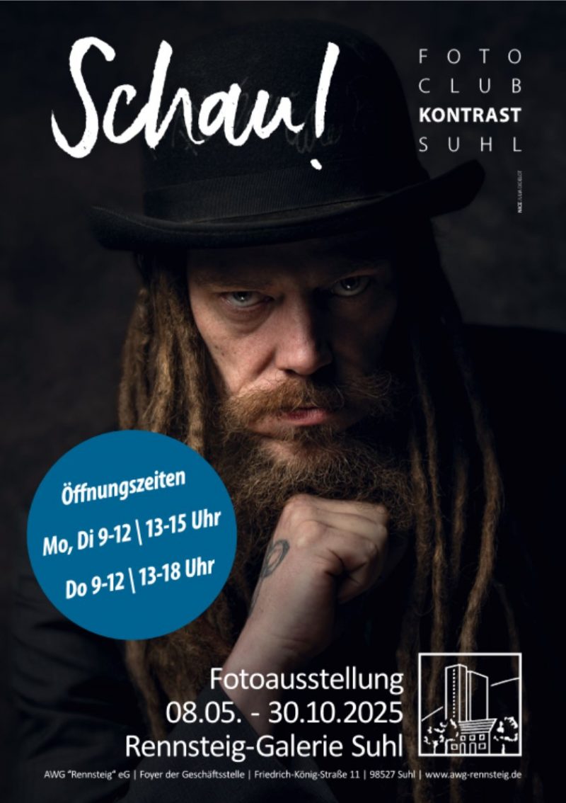 Die Mitglieder des Fotoclubs Kontrast Suhl stellen in iherer neuen „Schau!“ eine Auswahl ihrer besten Bilder vor. Freuen Sie sich auf ein Potpouirri fantastischer Fotoaufnahmen aus den Genren Porträt & Akt, Landschaft & Natur, Pflanzen & Tiere sowie Architektur & Kultur. Die Ausstellung kann bis zum 30. Oktober zu unseren Öffnungszeiten besichtigt werden. Mo &…