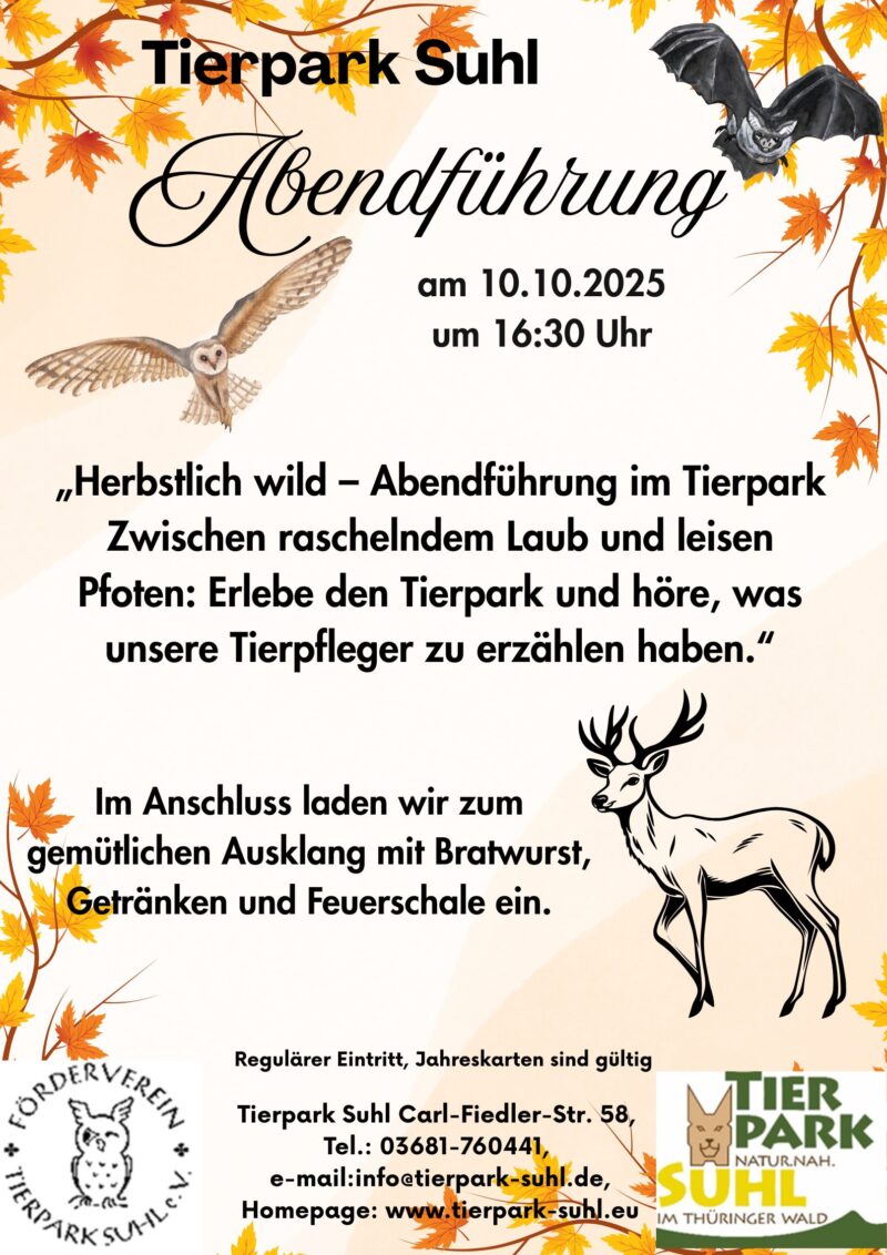 Abendführung im Tierpark – Geschichten, tierische Begegnungen und Ausklang des Tages Wenn der Tierpark schließt und die letzten Besucher gegangen sind, beginnt unsere Abendführung: Die Dämmerung legt sich über das Gelände, das Licht wird weicher, die Geräusche leiser – und der Tierpark zeigt sich von seiner geheimnisvollen Seite. In dieser herbstlichen Stimmung laden wir euch…