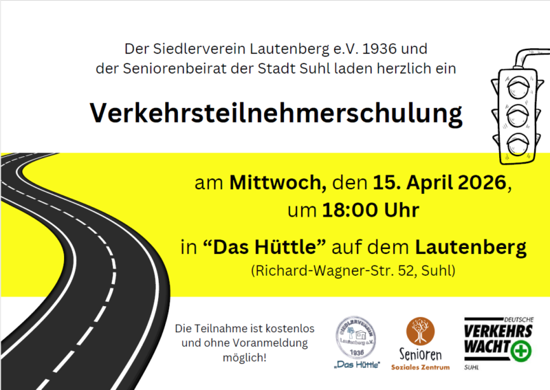 Der Siedlerverein Lautenberg e.V. 1936 und dem Seniorenbeirat der Stadt Suhl laden herzlich zur Verkehrsteilnehmerschulung am Mittwoch, den 15. April 2026, um 18:00 Uhr in “Das Hüttle” auf dem Lautenberg (Richard-Wagner-Str. 52, Suhl). Für die Teilnahme ist keine Voranmeldung nötig und sie ist kostenlos.