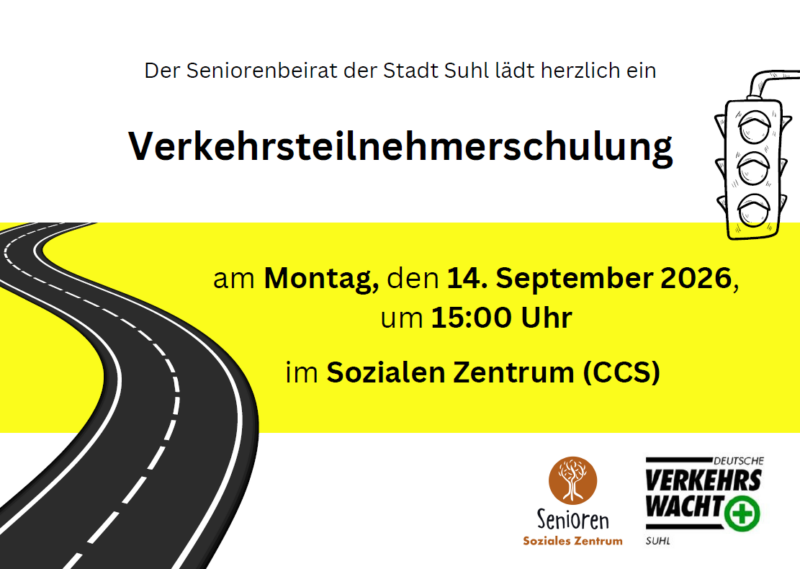 Der Seniorenbeirat der Stadt Suhl lädt herzlich zur nächsten Verkehrsteilnehmerschulung ins Soziale Zentrum im CCS ein. Rund um die Teilnahme am Straßenverkehr – egal, ob zu Fuß, mit dem Auto, dem Fahrrad oder dem ÖPNV – informiert der Referent Herr Holland zu aktuellen Neuerungen, beantwortet Ihre Fragen und lädt zu einer fachlichen Diskussion ein. Die…