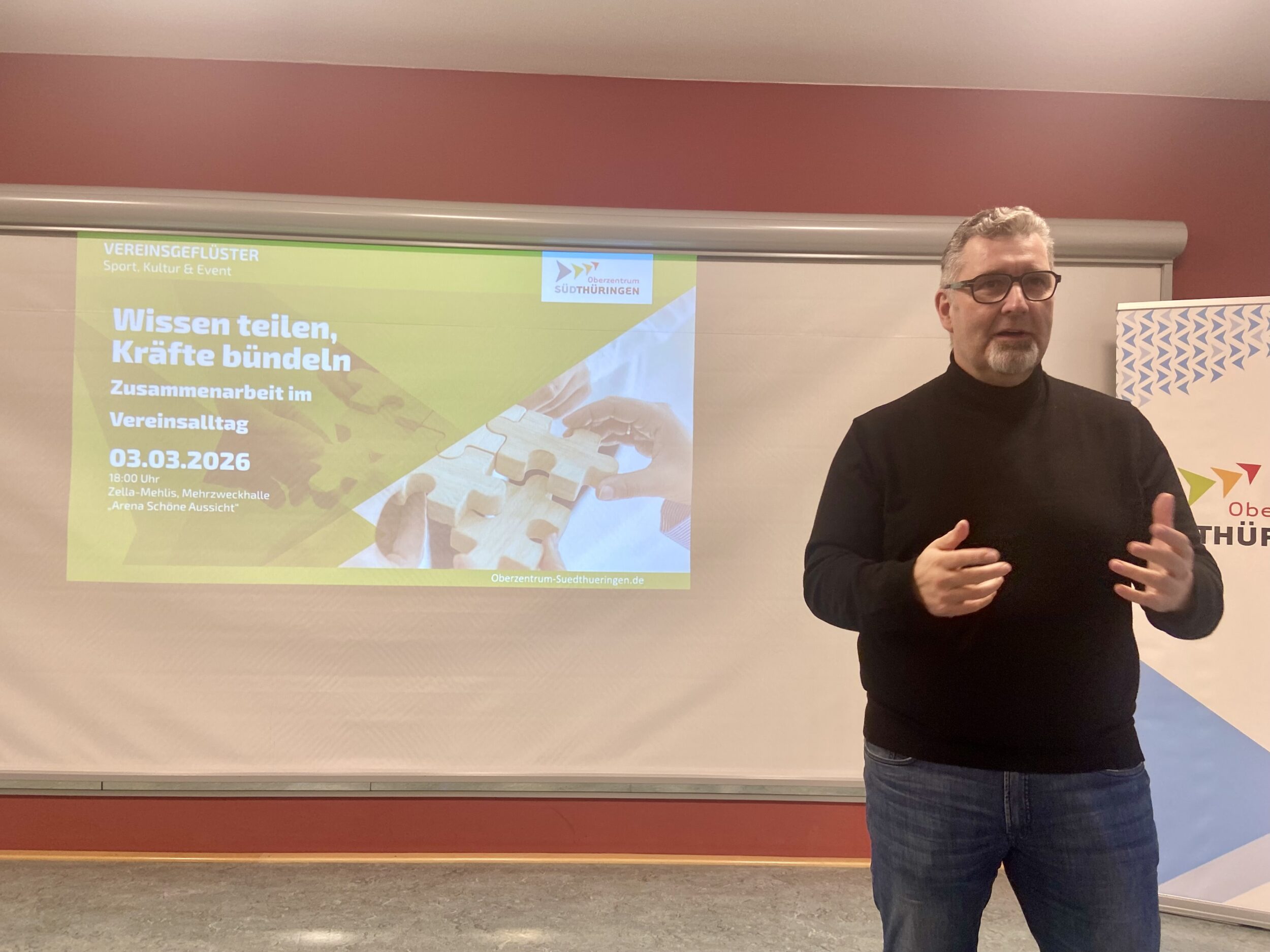 Unter dem Motto „Wissen teilen, Kräfte bündeln – Zusammenarbeit im Vereinsalltag“ trafen sich über 50 Vertreterinnen und Vertreter von 40 Vereinen aus allen vier Städten der Kommunalen Arbeitsgemeinschaft (KAG) Oberzentrum Südthüringen zum Vereinsgeflüster in der Mehrzweckhalle „Arena Schöne Aussicht“ in Zella-Mehlis. Ziel des ersten Geflüsters im neuen Jahr war es, den Austausch zwischen den Vereinen zu stärken, vorhandene Ressourcen sichtbar zu machen und neue Möglichkeiten der Zusammenarbeit zu entwickeln.